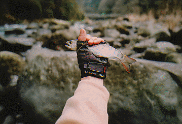 で立て続けに2匹のヤマメ・アマゴが掛かりました。しかし、サイズが小さい!!