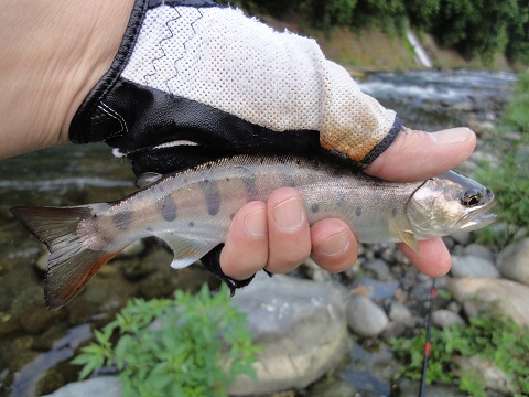 取りあえず、竿を出してみるとチビヤマメの応酬でした。たまに大きい奴が掛かったと思え